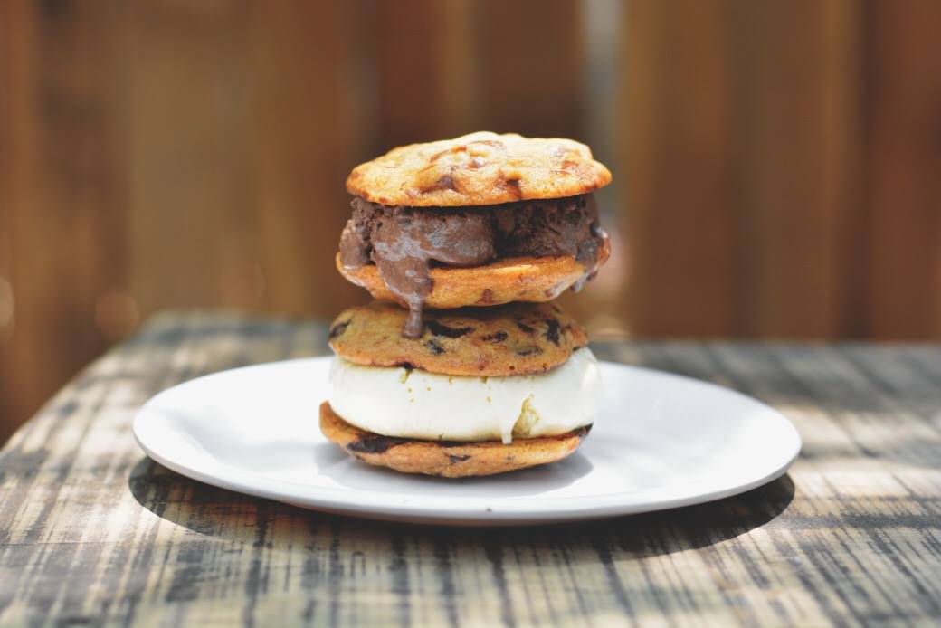 A scoop of homemade ice cream, sandwiched between two home made chocolate chip cookies, so yummy!